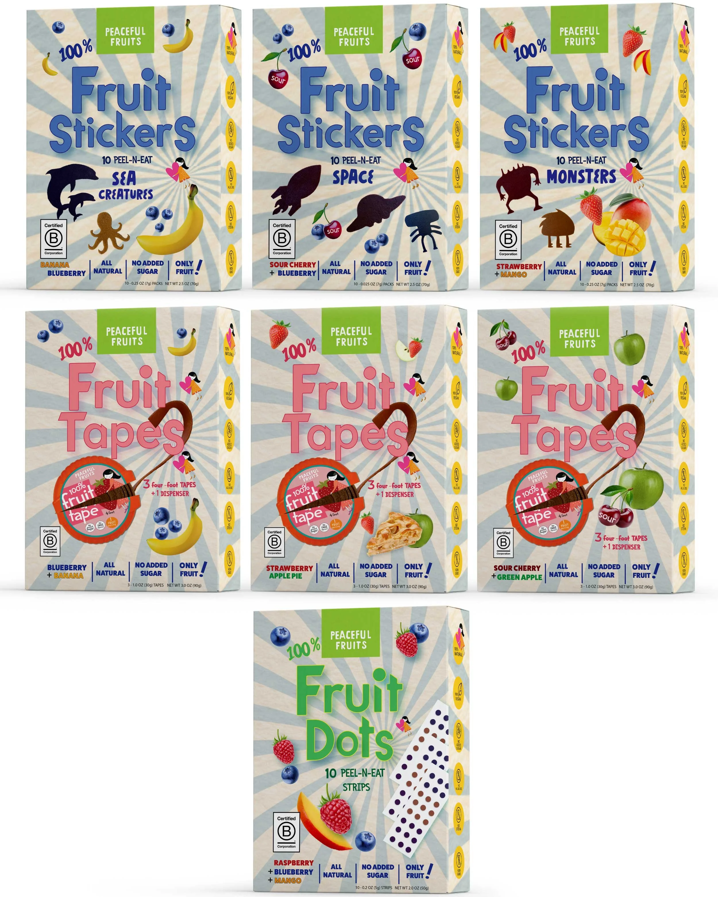 Feast on all 7 of our snack boxes, including 3 Peel-n-Eat Sticker boxes, 3 Tapes boxes, & 1 Peel-n-Eat Dots box. Sampler includes 8 flavors - blueberry, raspberry, strawberry, mango, banana, apple pie, sour cherry & green apple.